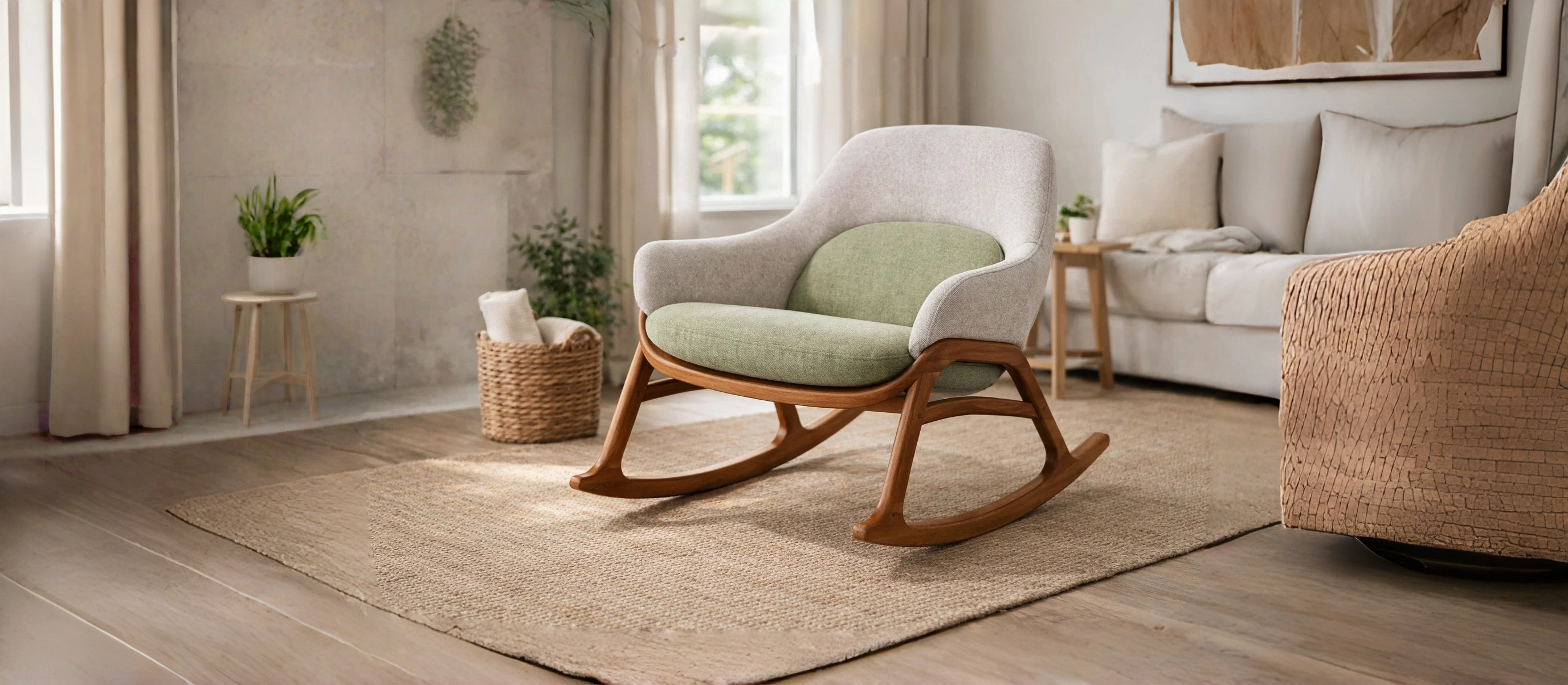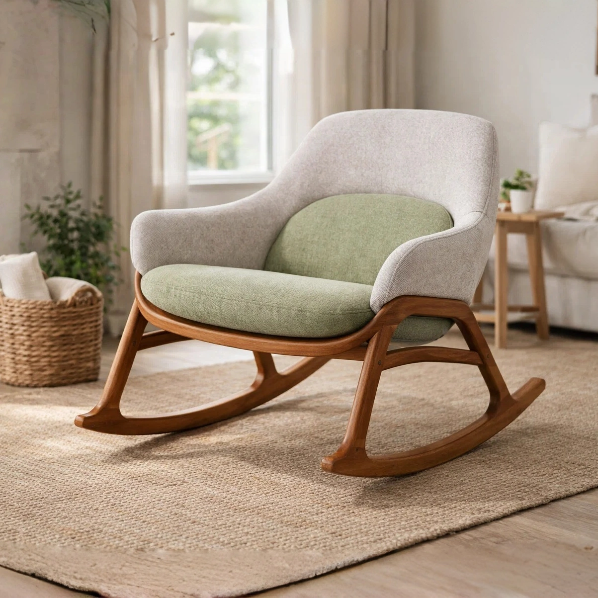 Mecedora de madera con tela de poliéster, en tonos beige y verde para uso interior.